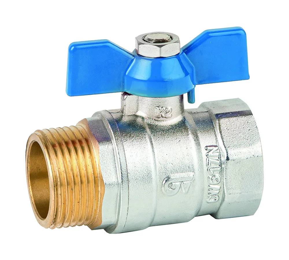 Messing kogelkraan met inwendig- en uitwendig schroefdraad voor watertoevoer, verwarming of airconditioning. De vleugelgreep is gemaakt van aluminium en de behuizing is gemaakt van vernikkeld messing.